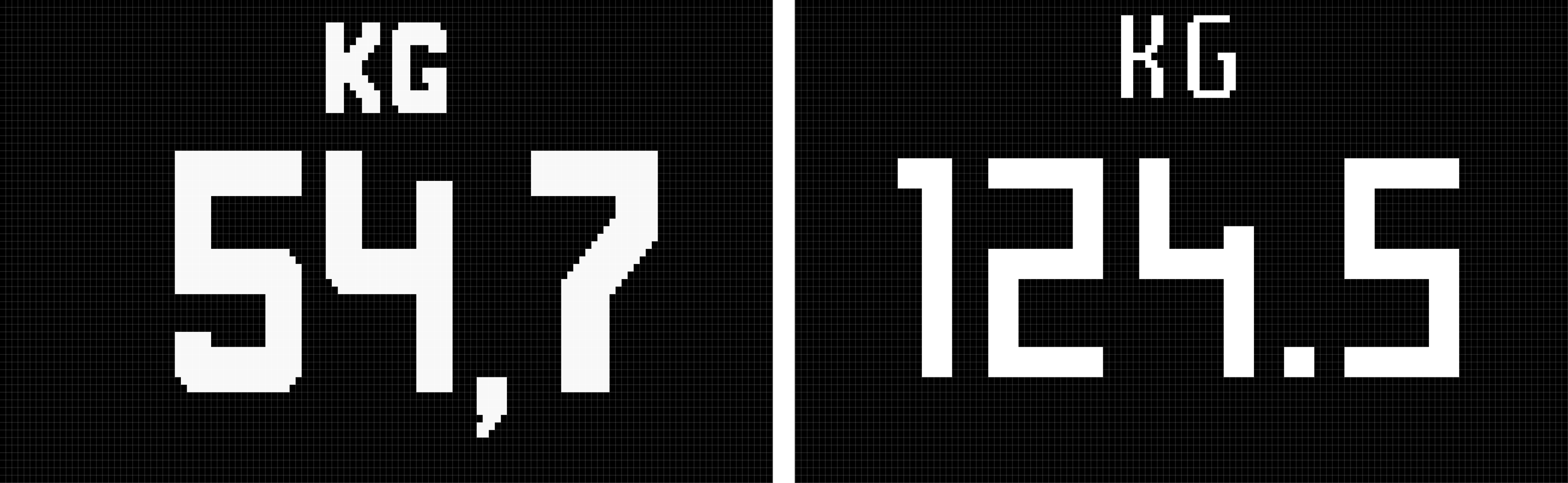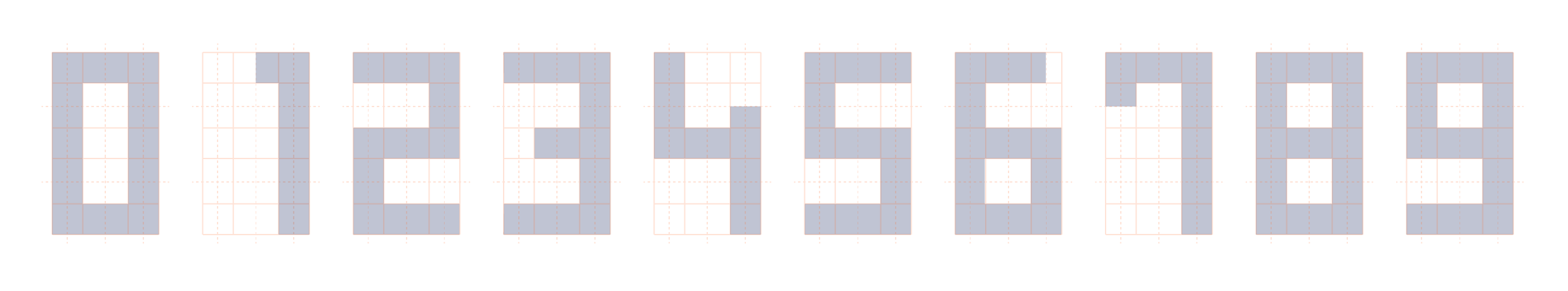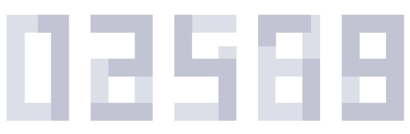 In a pure squared matrix, the digits would be 20 px high and 15 px large. Given the reading distance, I wanted to maximize the size of the digits for better legibility. Introducing wider spaces inside the matrix and playing with half squares units improved the grid both in legibility and style: