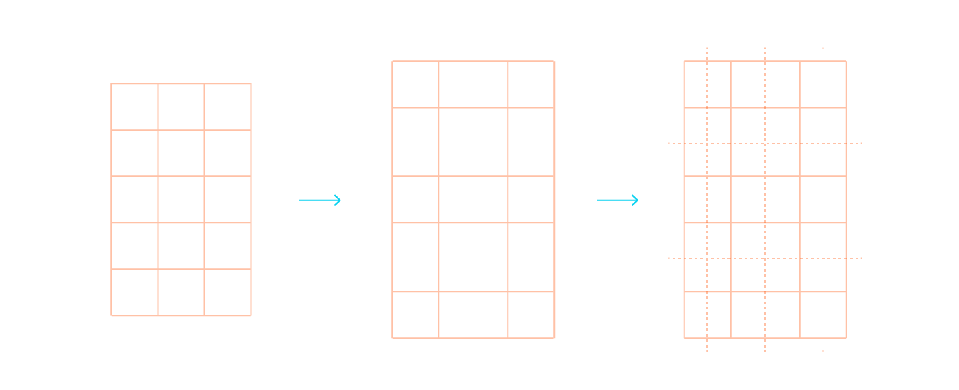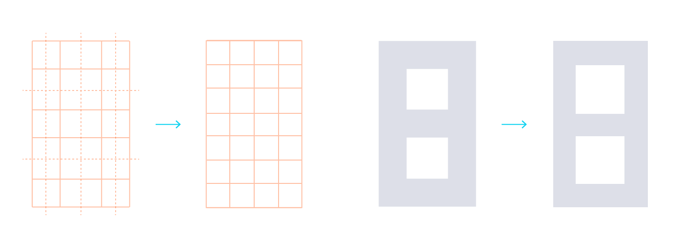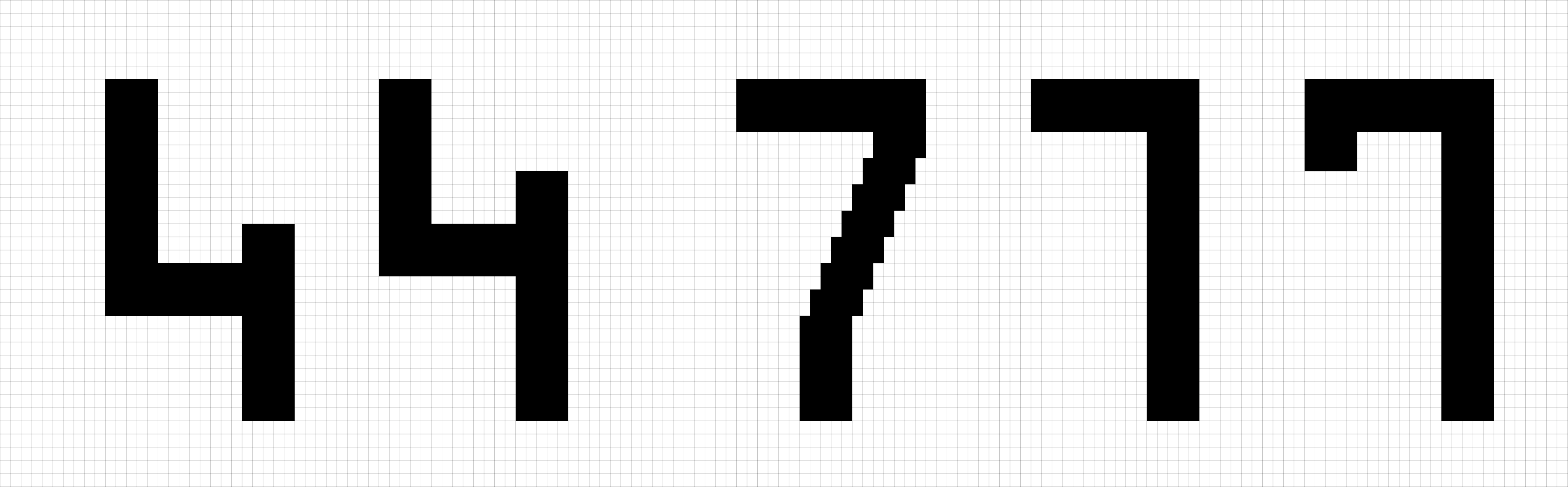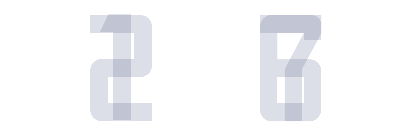 In a pure squared matrix, the digits would be 20 px high and 15 px large. Given the reading distance, I wanted to maximize the size of the digits for better legibility. Introducing wider spaces inside the matrix and playing with half squares units improved the grid both in legibility and style: