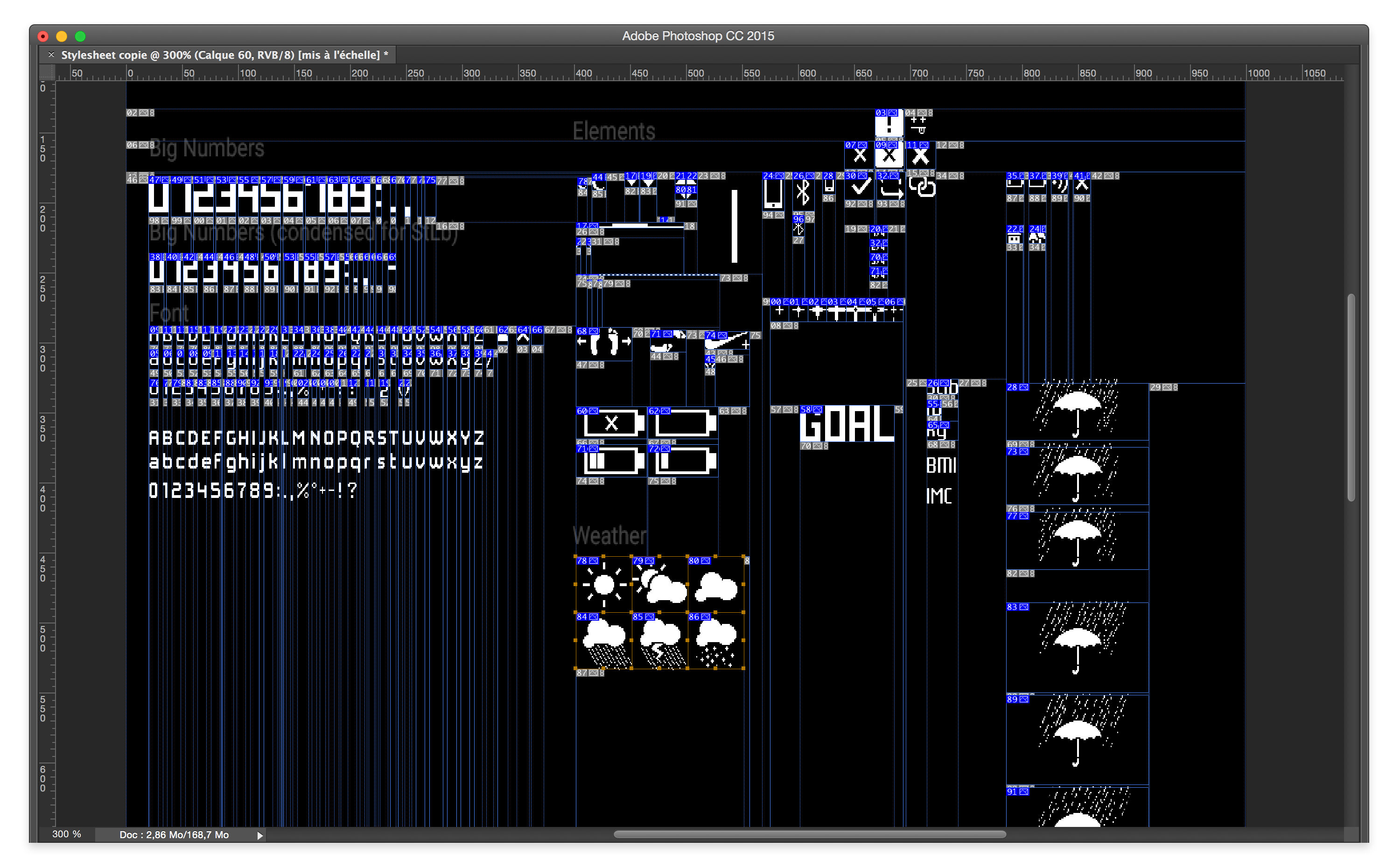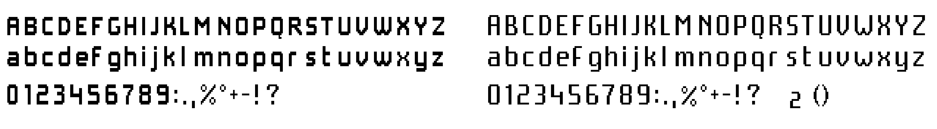 We also needed a smaller font for texts and secondary informations. This one would be alpha numerical. As it was smaller, it was not possible to create a perfect square. After a few tests, I decided to give the verticals a stronger weight than the horizontal, to give more inner space to the font and make it look thinner: