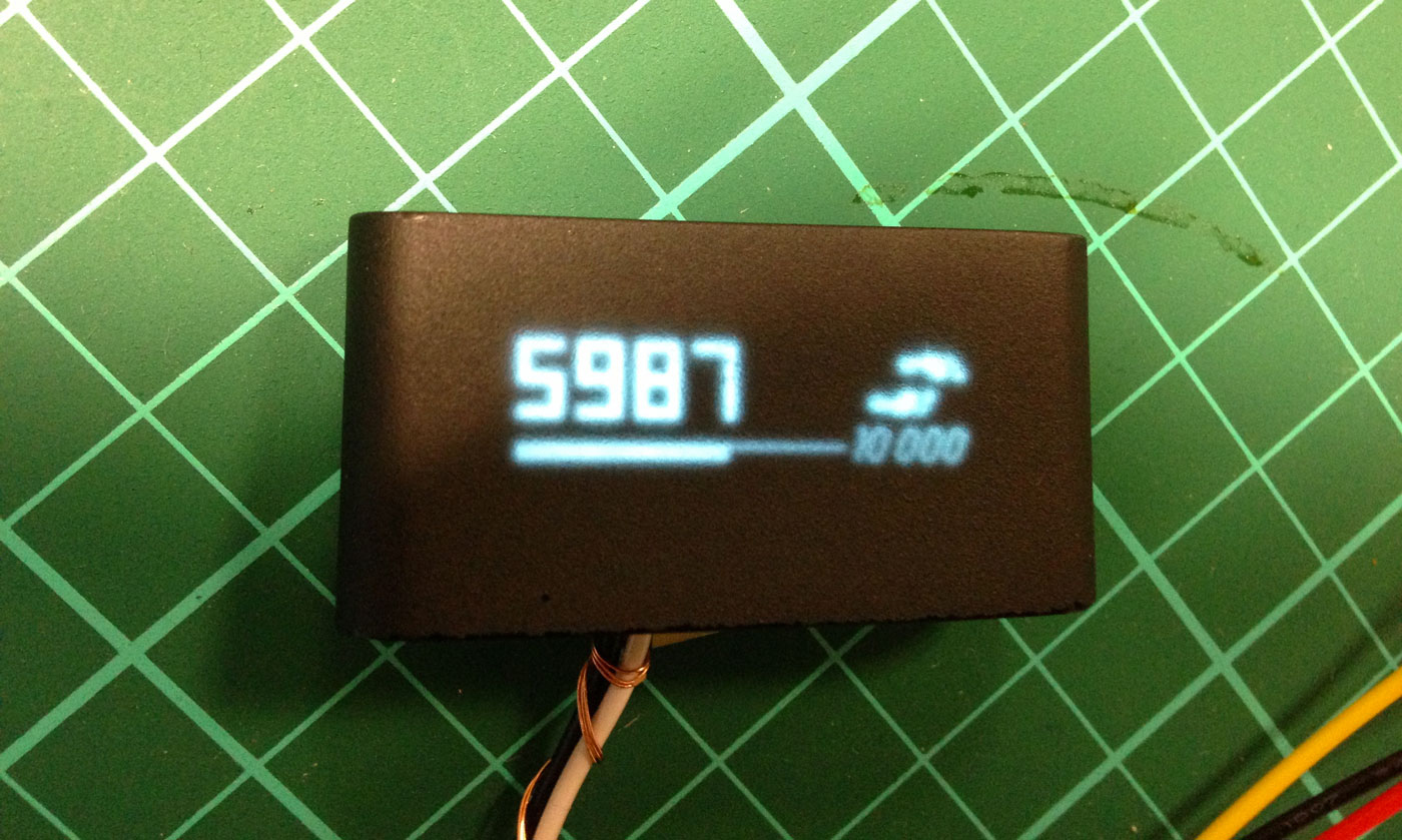 The Pulse's screen is a 1 x 0,3 inches (2,5 x 0,8 cm) mono color OLED screen with a 128 x 32 squared pixels definition, high frame rate and almost no afterglow. It is meant to be read from 20 inches (50 cm) distance. Again, no grey levels, so no Anti Aliasing.
